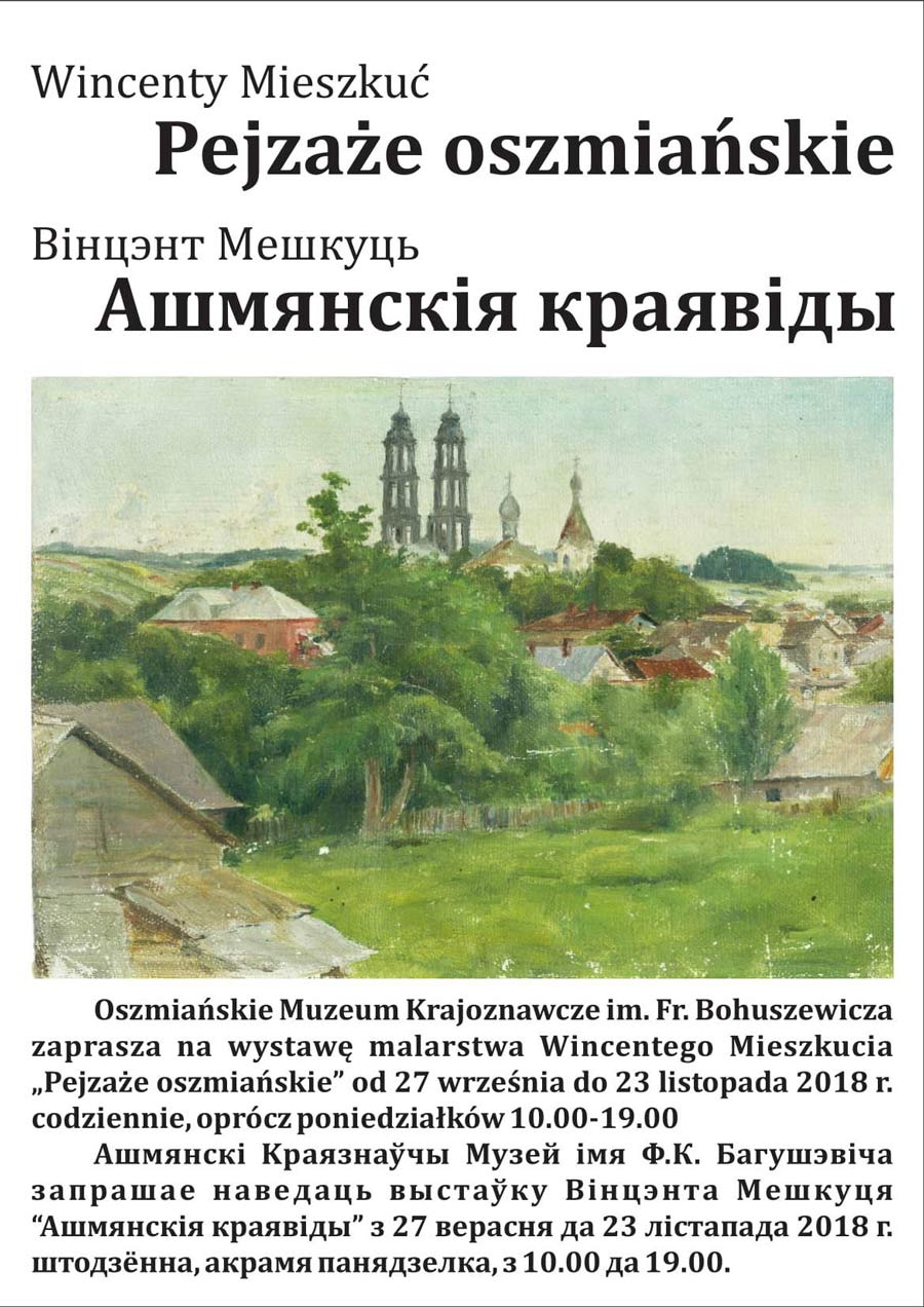 Учреждение культуры «Ошмянский краеведческий музей имени Ф.К. Богушевича» приглашает с 27 сентября по 23 ноября 2018 г. посетить художественную выставку Винцента Мешкуця “Ашмянскія краявіды”. Выставка организована в рамках Года малой Родины.