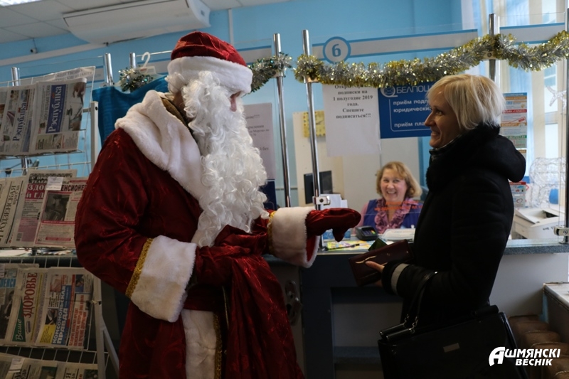 У мінулы чацвер, у разгар падпісной кампаніі на першае паўгоддзе 2019 года, газета «Ашмянскі веснік», як і абяцала, правяла для чытачоў традыцыйны дзень падпісчыка. А паколькі адбыўся ён напярэдадні любімых зімовых свят, удзел у ім прынялі не толькі супрацоўнікі рэдакцыі, але і нашы пазаштатныя сябры — Дзед Мароз са Снягуркай.