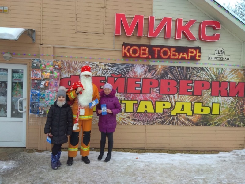 Магазин «МИКС» в Ошмянах специализируется на продаже пиротехнических изделий. В предновогодний период его посещает большое количество покупателей. Заглянул туда и Дед Мороз из РОЧС. Такой необычный подход в работе представителей пожарной службы вызвал положительные эмоции у покупателей магазина. Дед Мороз не стоял без дела, а поздравлял всех с наступающими праздниками, напоминал о соблюдении правил безопасности в период Нового года и вручал им профилактические брошюры «Безопасный Новый год». Посетители магазина смогли не только купить себе желанные товары, но и узнать основные требования безопасности по использованию пиротехнических изделий.