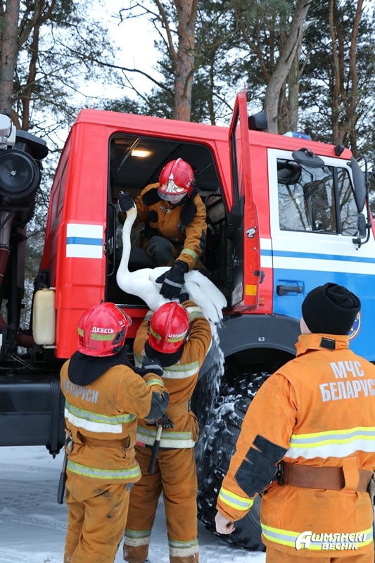 Недавно ошмянские спасатели-пожарные пришли на помощь лебедю, залетевшему во двор к людям. Перепуганная птица не могла найти выхода и билась крыльями о забор. Хозяева дома позвонили в службу 101. Смена в составе Валерия Дебеся, Андрея Русецкого, Руслана Антановича, Андрея Шулиневича и Ивана Шумского выбыла по месту вызова, в д. Буденовка.