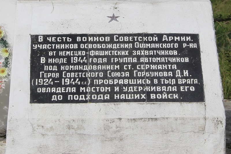 У складзе 97-й стралковай дывізіі (камандзір палкоўнік Ф.К. Жэка-Багатыроў) у 3-й роце 136-га стралковага палка служыў камандзір узвода старшы сяржант Дзмітрый Іванавіч Гарбуноў. Ён вызначыўся ў баях пры фарсіраванні рэк Сухадроўка, Бярэзіна і Лучоса. Гераічны подзвіг ён здзейсніў і ў Ашмянскім раёне, захапіўшы з групай аўтаматчыкаў мост цераз раку Ашмянку паміж вёскамі Нарбуты і Зарэчча. Фактычна была выканана такая задача, як і пры ўзяцці станцыі Ашмяны — перарэзана шаша Смаргонь — Ашмяны. За гэты і іншыя гераічныя ўчынкі Дз. І. Гарбуноў атрымаў званне Героя Савецкага Саюза (загінуў пад Каўнасам 28 ліпеня 1944). 7 ліпеня 1975 г. непадалёку ад месца подзвігу групы аўтаматчыкаў быў пастаўлены помнік; у Ашмянах, пачынаючы з лістапада 1975 г., праводзіліся спаборніцтвы па мотаспорце на прыз імя Дз.І.Гарбунова.