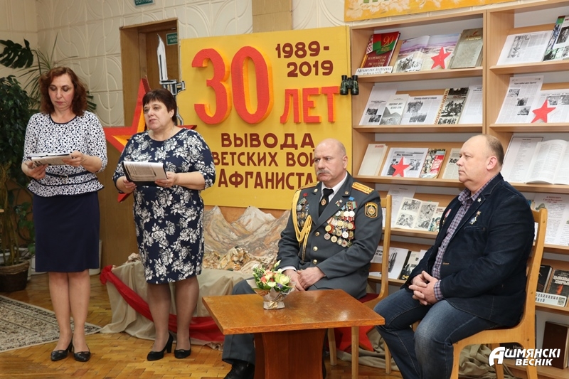 На сустрэчу з чытачамі бібліятэкі завіталі воіны-афганцы — старшыня Ашмянскага раённага грамадскага аб’яднання “Беларускі саюз ветэранаў вайны ў Афганістане” Мікалай Станіслававіч Лаздзін і удзельнік вайны Уладзімір Генрыхавіч Гіруць.
