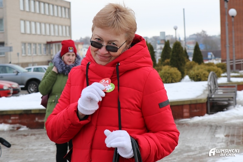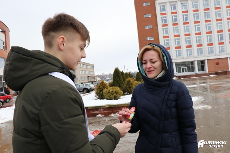 В четырнадцатый февральский день волонтеры первичной организации гимназии №1 вышли на улицы города, чтобы вручить ошмянцам красно-зеленые сердечки с надписью «За любимую Беларусь!». Жители города были приятно удивлены таким подаркам и с удовольствием принимали поздравления.