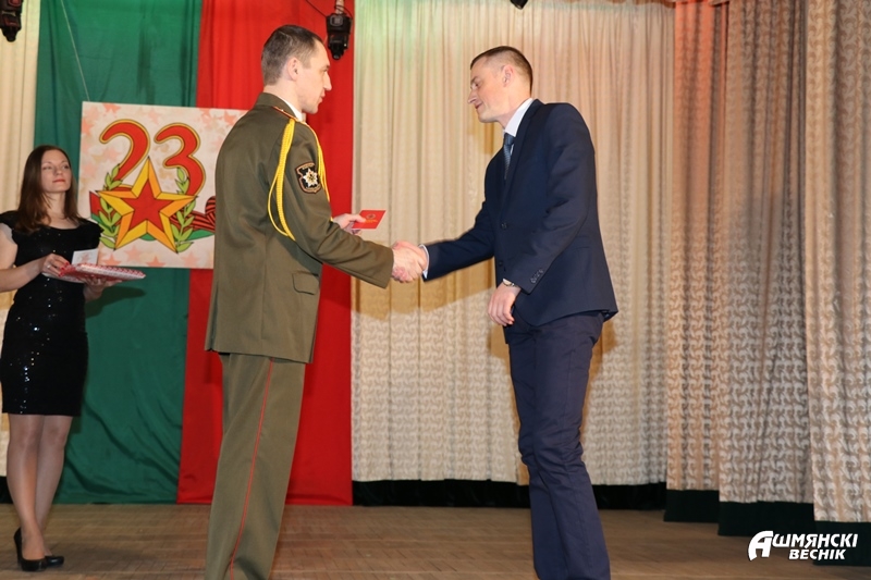 Юбилейные медали «100 год Узброеным Сілам Рэспублікі Беларусь» вручили начальнику группы территориальной обороны военного комиссариата Андрею Александровичу Ермоленко, начальнику районного отдела Следственного комитета Республики Беларусь Виктору Валентиновичу Мацевичу, первому заместителю начальника РОВД Ошмянского райисполкома Дмитрию Тадеушевичу Винцковскому,