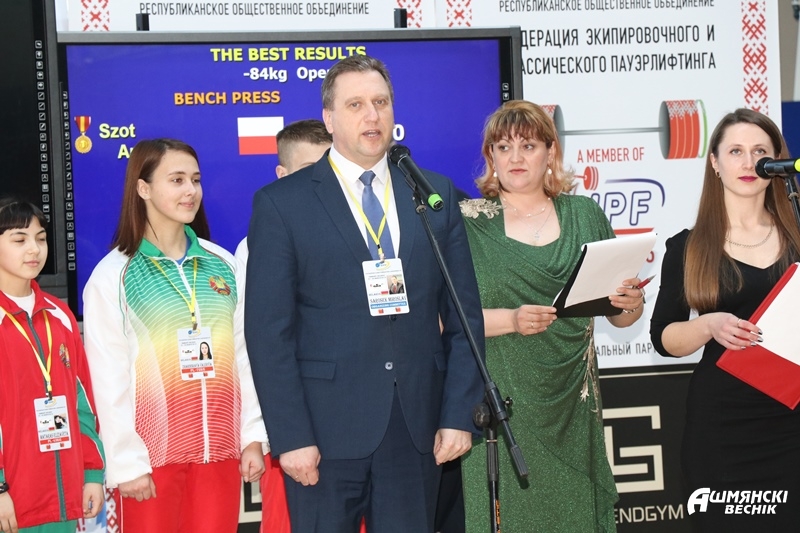 В торжественном открытии Кубка Европы по пауэрлифтингу приняли участие председатель Ошмянского райисполкома Мирослав Саросек, начальник отдела спорта Управления спорта и туризма Гродненского облисполкома Александр Дернейко, председатель РОО «Федерация классического и экипировочного пауэрлифтинга» Денис Пискунов, президент европейской федерации пауэрлифтинга Арнульф Вольстром, генеральный секретарь Европейской федерации пауэрлифтинга Ральф Фергюсон, председатель технического комитета Европейской федерации пауэрлифтинга Мириам Басселот, регистратор мировых и европейских рекордов Анатолий Стеценко, председатель дисциплинарного комитета РОО «Федерация экипировочного и классического пауэрлифтинга» Наталья Сапронова.