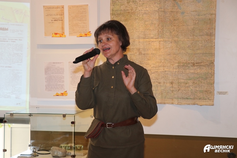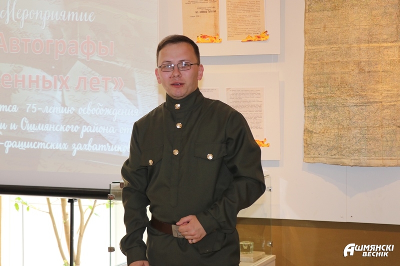 Выставка, подготовленная к 75-летию освобождения Беларуси и Ошмянского района от немецко-фашистских захватчиков в краеведческом музее имени Франтишка Богушевича, собрала бесценные документы, которые с интересом можно посмотреть всем, потому что нет у нас такой семьи, которую бы не затронула война. Вот и ребята из гимназии города, пришедшие на открытие, с огромным вниманием вслушивались в каждое слово ведущих мероприятия – сотрудников краеведческого музея. Перед этим они смогли увидеть музейные документы – фотографии, вырезки из газет, рассказы очевидцев, зафиксированные на бумаге, сводки с фронта, письма. Все эти бесценные реликвии можно назвать автографами военных лет тех людей, кто писал их «на ложе автомата, плечом к окопу прислонясь…». Все эти документы требуют к себе особого внимания, особого прочтения, потому что в них зафиксировано прошлое, продолжением которого стали мы все ныне живущие на этой земле. Особенность данной выставки заключается в том, что на ней представлены материалы, которые редко выносятся на обозрение широкому кругу посетителей: переписка с архивами, воспоминания, донесения и рапорты партизан, справки, записные книжки, листовки, подпольные выпуски газеты «Знамя свободы» и многое другое. Кажется, что за скупыми строками каждого из документов прослеживается судьба человека, которому пришлось воочию встретиться с войной и пережить все тяготы военного лихолетья.
