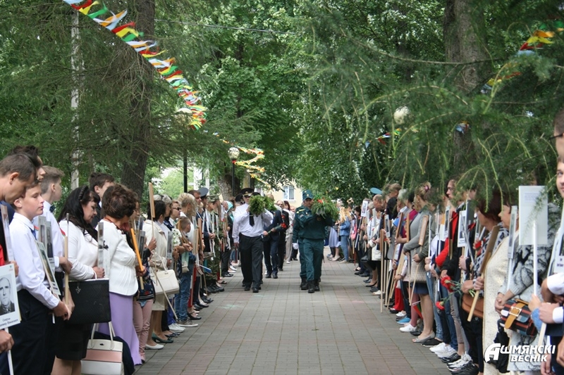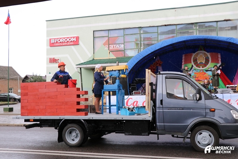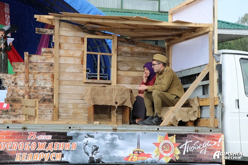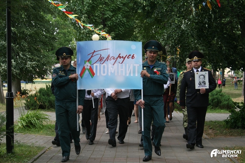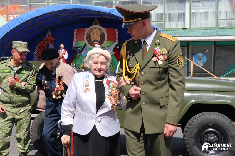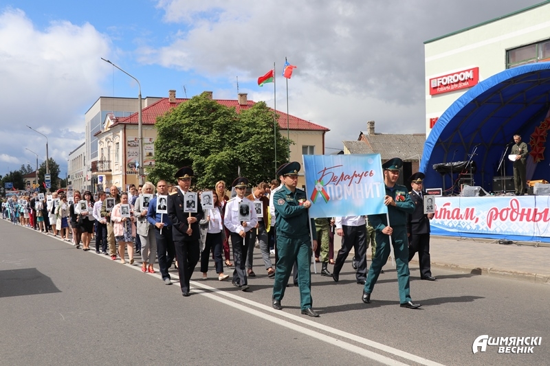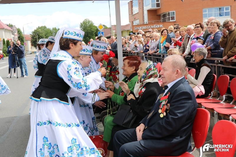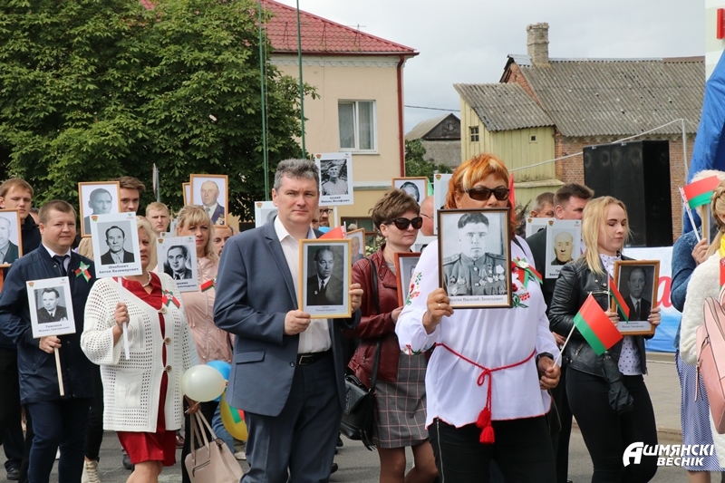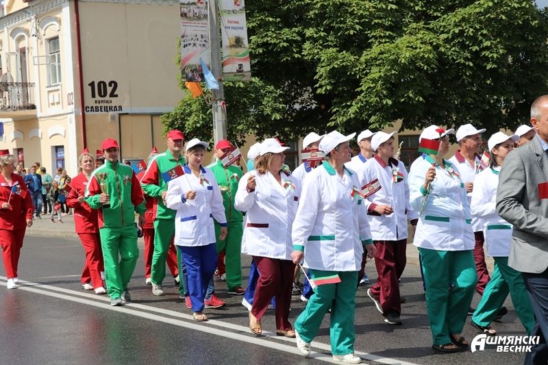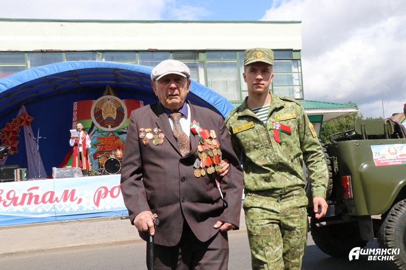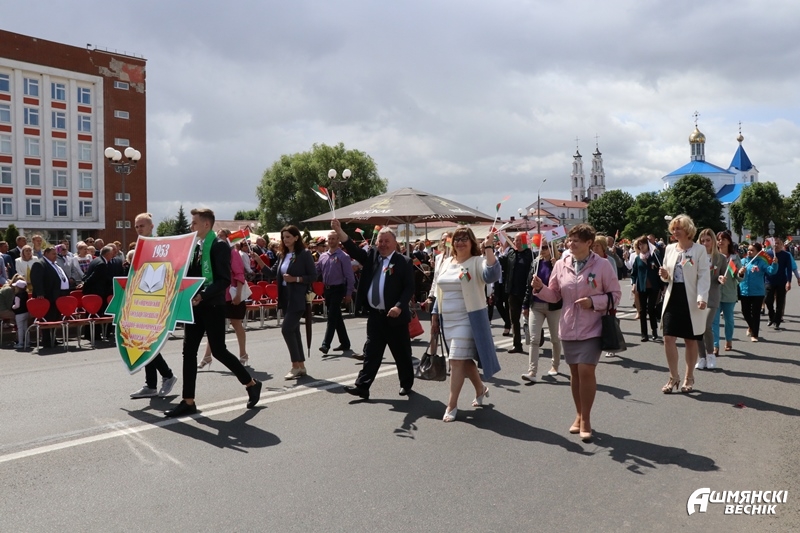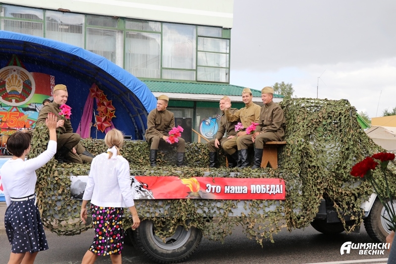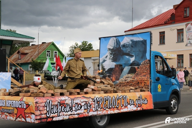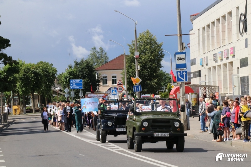 Продолжило торжество праздничное шествие колонн организаций и предприятий района, общественных объединений, по праву возглавили которое, конечно, ветераны Великой Отечественной войны и узники фашистских концлагерей. Будто на много лет назад, в далекую юность, перенесли стилизованные автомобили Казимира Ивановича Заблоцкого, Татьяну Степановну Мягкову, Владимира Владимировича Лашкевича, Бронислава Ивановича Шагидевича, Василия Кирилловича Жевняка, Марию Егоровну Селедцову, Татьяну Федоровну Аликберову, Михаила Александровича Ханеню… Вслед за ними «живой рекой» двигались портреты тех, кто ценой своей жизни и здоровья отстоял мир и независимость, — благодарная память потомков нашла отражение в патриотической колонне «Беларусь помнит».
