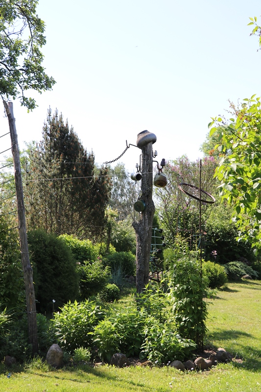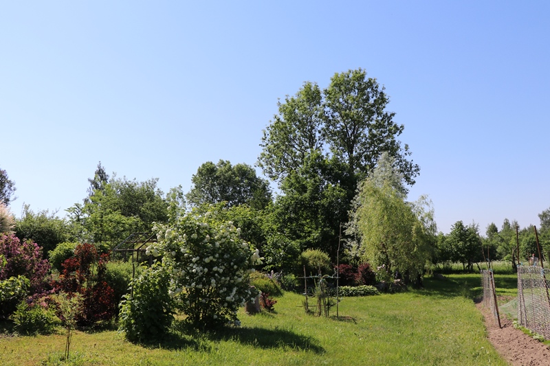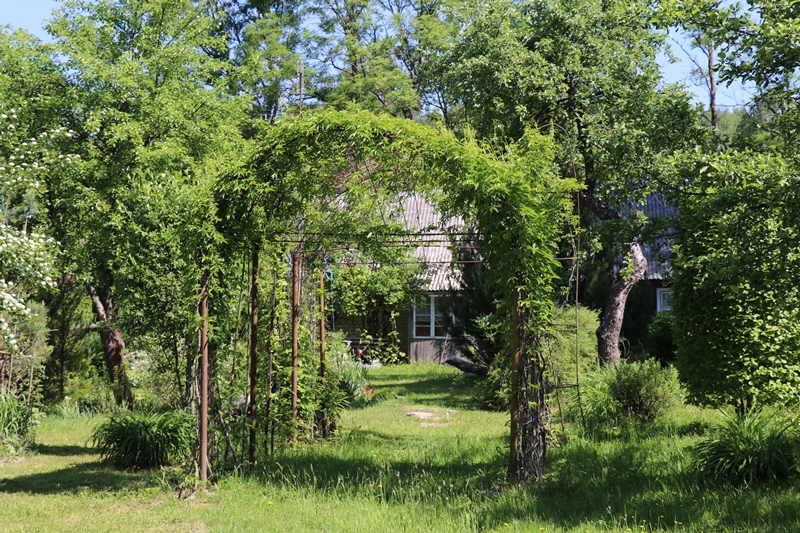 Весь участок разделен на зоны. Для его разделения используются обычные деревянные колья, веревки. Рядом с их высокими опорами высажены плетистые растения: розы, клематисы, жимолость, много арок с лианами и вьющейся кобеей. Бордюры выполнены из обычного камня. Дополняют композиции цветочных растений элементы декора, выполненные своими руками: скамейки, беседки, арки. Возле них цветут однолетние цветы, они высажены в несколько ярусов, и очень хорошо просматриваются со всех сторон. Все ярусы сочетаются по окраскам, а клумбы – пестрят разноцветием. Украшением территории служат обрезанные стволы старых деревьев, они смотрятся оригинально и интересно, потому что оформлены старыми хозяйственными декорациями, в виде кадок, горшков, корзин, глиняной посуды, а под стволами густо пестрят цветы. Хозяин подводит нас к колодцу и летнему душу, они также выполнены в необычном стиле. Оказывается, что колодец имеет давнюю интересную историю. Как рассказал Зигмунд Вильгельмович, как раз на том месте, где сейчас он расположен, проходила граница разделения территорий двух стран. Если верить литовскому документу, датированному 1865 годом, то по правую сторону от колодца была граница и земля принадлежала литовцам, а по левую — белорусам. Этот документ долгое время хранился в семье Адамовичей. Так что, шутит хозяин, он пьет воду двух государств.