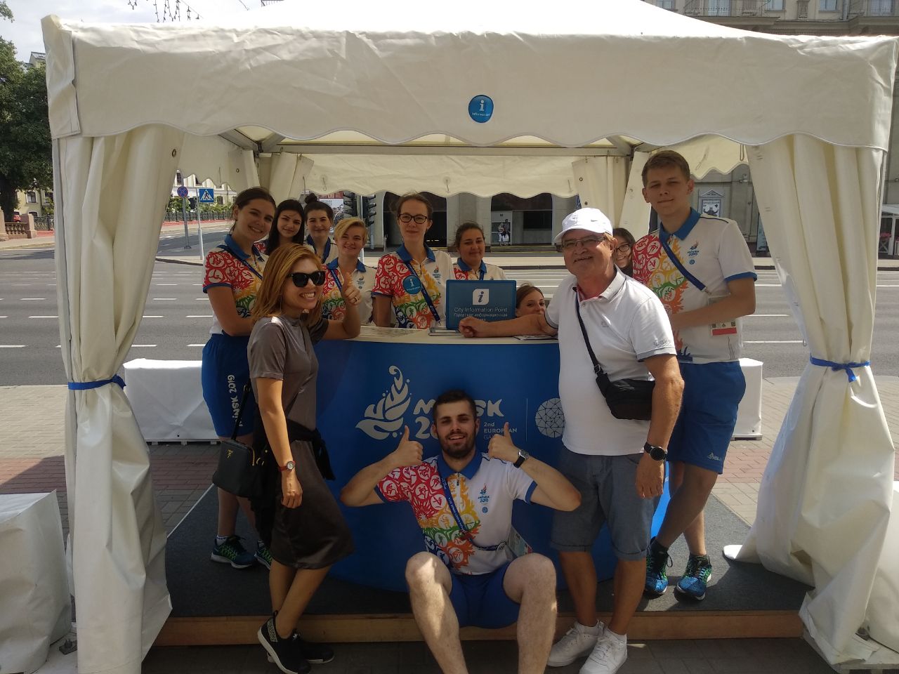 Наша городская информационная точка начала работать за несколько дней до открытия II Европейских игр. В нашу задачу входило предоставление гостям и жителям столицы необходимой информации: где проходят соревнования, что можно посмотреть в городе, куда сходить… Перед тем как приступить к работе, мы встретились всей командой, чтобы познакомиться. До начала смен мы выяснили, кто какими языками владеет и на каком уровне. Приятно было попасть в команду таких же замотивированных, настроенных на позитивную работу ребят. Многие студенты были из моего университета, хотя раньше мы даже не встречались, потому что учимся на разных факультетах.