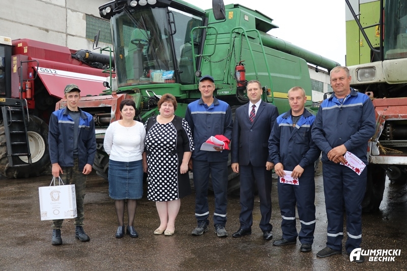 В трудовом тандеме комбайнер Сергей Марачевский и его помощник Юрий Яцковский из Гольшан на комбайне марки «КЗС -1218» намолотили 525 тонн, а с начала жатвы приближаются к заветной тысяче – 916 тонн. В экспериментальной базе «Боруны» на комбайне марки «КЗС -1218» работает Иван Пригодский. За десятидневку комбайнер намолотил 314 тонн, а с начала жатвы – 733 тонн хлеба нового урожая. Со 2 по 11 августа водитель Чеслав Шукелович («Ошмянский рассвет») на автомашине марки «ГАЗ-53» перевез 359 тонн, а водитель Виталий Козловский («Боруны») на автомашине марки «МАЗ-5551» — 521 тонну. Оба водителя с начала жатвы перевезли уже больше тысячи тонн. Поздравляя передовиков соревнования, председатель Ошмянского райисполкома Мирослав Саросек отметил, что трудовые успехи достигнуты благодаря усердному и ответственному труду рядовых тружеников – комбайнеров и их помощников, водителей, которые, не считаясь с личным временем, стремятся своевременно убрать хлеб и позаботиться уже об урожае будущего года. Он вместе с председателем райкома профсоюза работников АПК Раисой Турлай не только пожали руку каждому из передовиков и поблагодарили за работу, но и вручили дипломы, сертификаты, подарки.