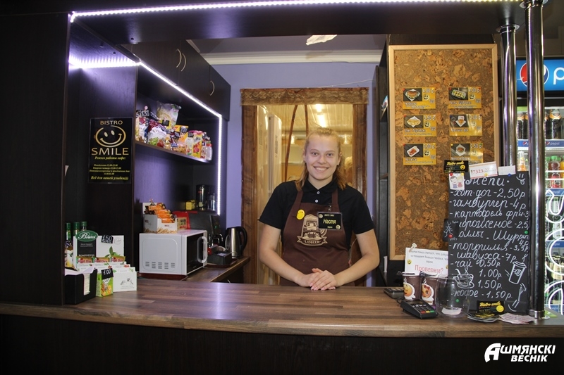 Бистро SMILE расположилось на цокольном этаже в здании «Олимп», что напротив городской почты. Полноценное кафе с посадочными местами на разное количество человек, если позволяет погода – можно расположиться и на улице: на прилегающей территории тоже есть несколько столиков. В меню на сегодняшний день 10 позиций, но владельцы: брат с сестрой — Петр Явидович и Елена Артем — обещают в будущем не менее, чем 20.