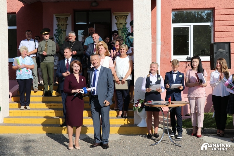 Сегодня у гимназистов двойной праздник: открытие нового корпуса и День знаний. Символический ключ от здания передал коллективу гимназии в лице директора Ольги Саванец бывший «хозяин», депутат Ошмянского районного совета депутатов 28 созыва Владимир Бизюк.