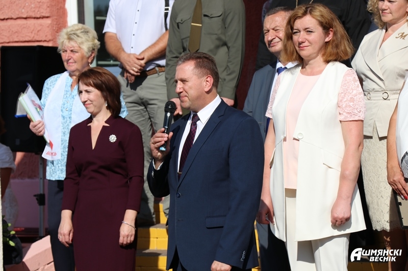 Председатель райисполкома Мирослав Саросек обратился к школьникам, учителям и гостям линейки с поздравительным словом и подарил сертификат на приобретение спортивного инвентаря:
