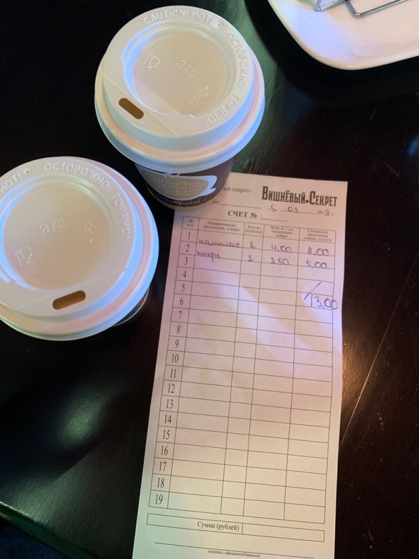 Мясо мы все же едим, поэтому остановились на втором варианте обеда: драники с мясом, салат, компот. Кофе из основного меню решили взять на вынос. Итоговый чек на человека – 6,50 рублей, что вполне себе гуманно, даже во многих студенческих столовых тот же набор обойдется дороже, проверено лично.