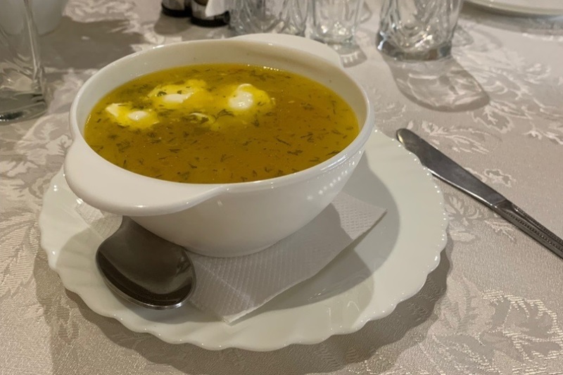 Как только мы зашли в банкетный зал, официант сразу же предложил обеденное меню и указал на свободные столики. Основное меню даже не предлагают. То ли из-за невнимательности, то ли из-за того, что в такой временной промежуток (мы пришли в час дня) сюда приходят исключительно на обед. На каждом столике стоит табличка с распечатанными вариантами обедов на сегодняшний и завтрашний день. Предлагают три варианта комплексов. Первый за пять рублей: щи, котлета с пюре и напиток (чай или компот на выбор). Комплекс № 2 за шесть рублей: суп перловый с грибами, блин по-ошмянски (нам пояснили, что это что-то наподобие драника с мясной поджаркой) и напиток на выбор, как и в первом варианте. Третий комплекс стоит тоже пять рублей: суп с лапшой, куриная отбивная и напиток. Ничего изысканного и сверхъестественного. К чаю или с собой официанты предлагают пирожки: с повидлом за 30 копеек и с мясом за 94 копейки. Просто, сытно, недорого и по-домашнему вкусно. Еда выглядит аппетитно, все горячее и свежее.