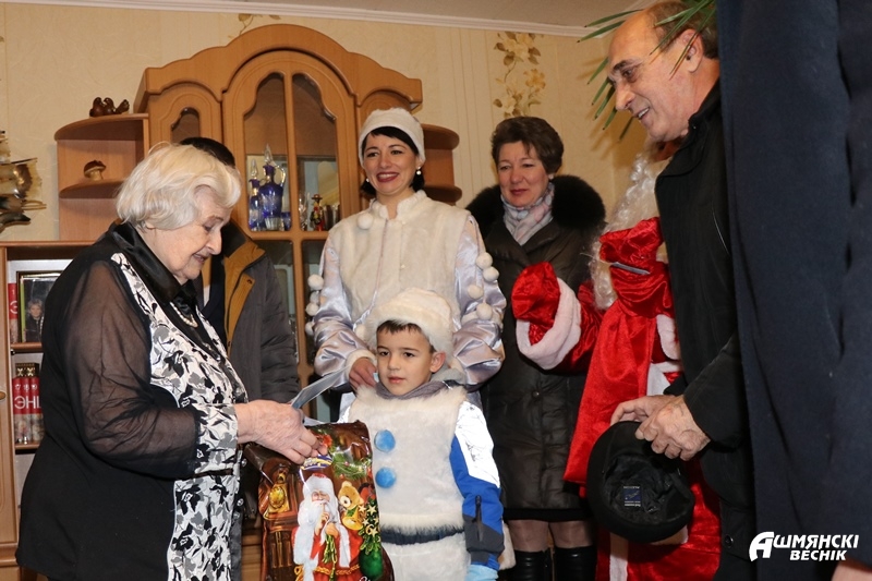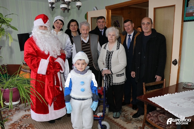 Сапраўднае навагодняе свята ветэранам падарылі загадчык аддзялення сацыяльнай дапамогі на даму Станіслава Сырамалот, загадчык аддзялення дзённага знаходжання для пажылых грамадзян ТЦСАН Аксана Бітэль і яе малодшы сын Міхаіл, якія пераапрануліся ў касцюмы Дзеда Мароза, Снягуркі і Снегавіка.