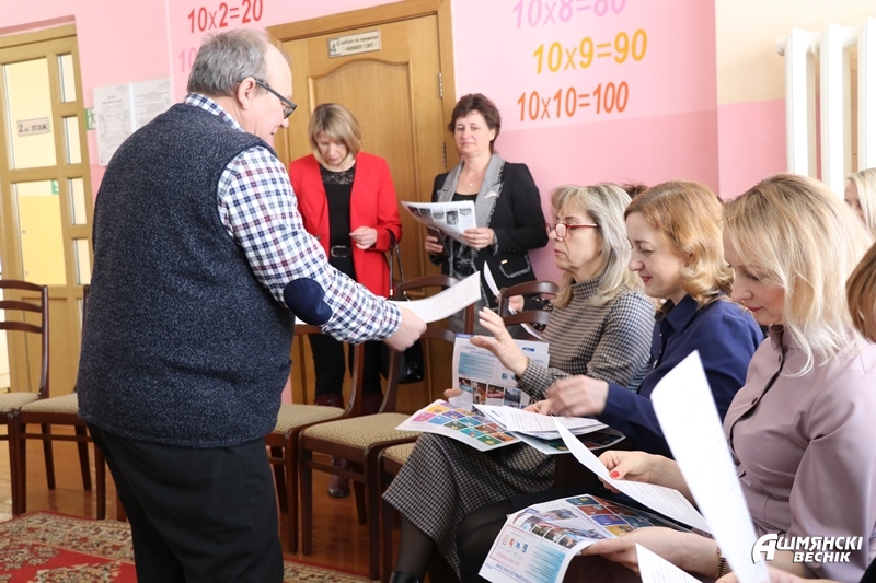 Настаўніца беларускай мовы і літаратуры СШ №2 Вольга Дваранская разам са сваімі калегамі прыйшла ў суботу ў СШ №1, каб сустрэцца з загадчыкам кафедры рэдакцыйна-выдавецкіх тэхналогій БДТУ, дацэнтам, кандыдатам філалагічных навук Уладзімірам Куліковічам.