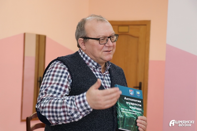 Уладзімір Куліковіч зрабіў агляд літаратуры, выдадзенай на кафедры рэдакцыйна-выдавецкіх тэхналогій БДТУ. Гэта і яго ўласныя метадычныя дапаможнікі, і распрацоўкі па граматыцы, арфаграфіі, лексіцы, і выданні студэнтаў (іх дыпломныя працы). Выставу Уладзімір Куліковіч назваў “Ашмяншчыны натхненне”. Як прызнаўся наш госць, большасць кніг узнікла менавіта тут, на Станцыі Ашмяны, дзе апошнім часам Куліковіч бывае даволі часта. Уладзімір Іванавіч прэзентаваў настаўнікам адну з апошніх кніжак “Беларускія месяцы”, якая будзе цікава рознаўзроставай аўдыторыі: ад вучняў пачатковых класаў да іх бацькоў і, безумоўна, саміх настаўнікаў.
