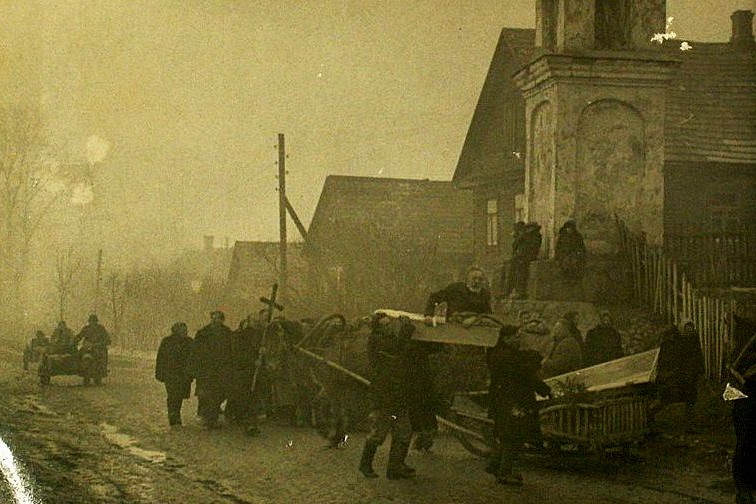 Цікава было прачытаць пра здымкі яшчэ адной сцэны. Наперадзе калоны, што рухалася ад капліцы да цэнтральнай вуліцы, павінны пранесці труну з пакойнікам, але знайсці “героя” без забабонаў у галаве, які б пагадзіўся на такі эксперымент, было амаль немагчыма. Таццяна Лаўрыновіч піша: “Ніхто не хацеў лягаць у труну, але пасля змаглі дамовіцца з адным мужчынам. У той дзень мароз быў моцны, здымуць эпізод, ён злезе з труны пагрэецца і зноў лягае. Пранясуць яго ўперад, а потым вяртаюцца на першапачатковую кропку, ён тады сядае ў труне і жанчынам рукой махае. Усе смяюцца, рагочуць…”.