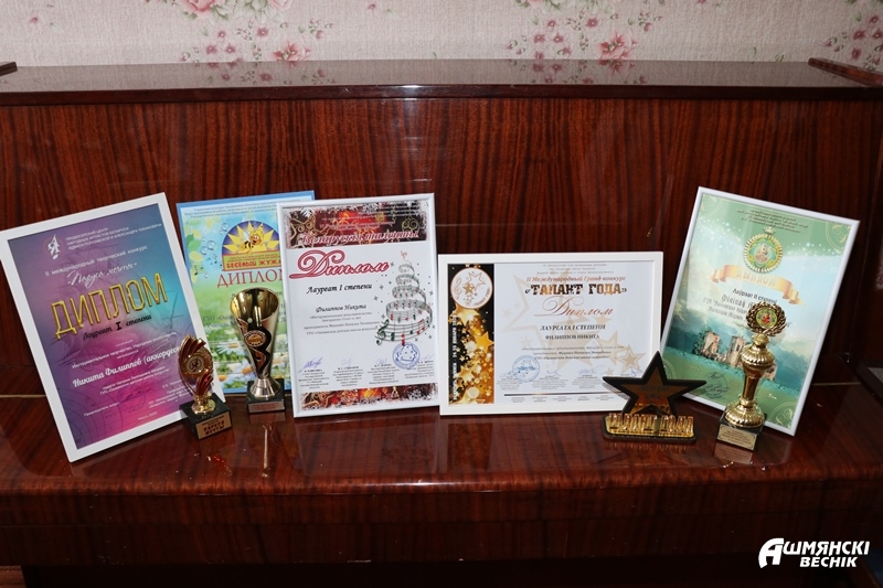 За четыре года учебы в детской школе искусств аккордеонист Никита Филиппов не раз становился победителем творческих конкурсов. В копилке юного музыканта успешные выступления на международных конкурсах “Паруса мечты”, “Талант года” и “Новые вершины”, республиканских – “Беларускія таленты”, “Львенок”, региональных и районных — “Веселый Жужа” и “Музыкі ля замка Сапегаў”. Этот год принес юному дарованию сразу три победы в престижных творческих «соревнованиях».