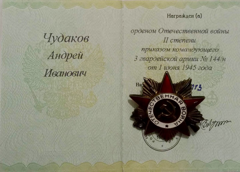 Современные технологии, вне сомнения, хорошо помогают возвращать память о военных событиях. Много информации выкладывается в интернете по теме Великой Отечественной войны, и за этим Игорь Чудаков постоянно внимательно следил. Документ Центрального архива Министерства обороны Российской Федерации, который пришел на его имя, подтвердил наличие еще одной высокой государственной награды отца. В извещении указывалось, что приказом командующего 3 гвардейской армии №144/н от 1 июня 1945 года Андрей Иванович Чудаков награжден орденом Отечественной войны 2 степени. Отметки о вручении награды не имеется.