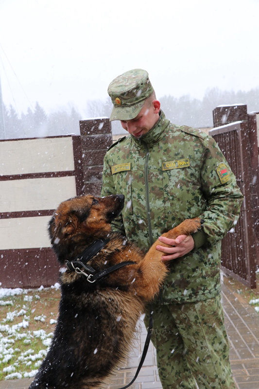 Служба у четвероногих такая же напряженная, как и у их хозяев, – дневные и ночные дежурства чередуются с постоянными тренировками. Сейчас на заставе несут службу четыре собаки, каждая из которых прошла серьезную подготовку в кинологическом центре Сморгонской пограничной группы. Оттуда прибыл и пес породы немецкая овчарка – Скиф. Его хозяин, новогрудчанин Павел Бородин, как раз отдыхал после неспокойной ночи на границе. За год службы в пограничных войсках вместе с четвероногим сослуживцем он не раз выезжал на границу и принимал непосредственное участие в задержаниях. Павел признается, что с собакой на границе служить намного интереснее, а каждый день на службе приносит что-то новое.