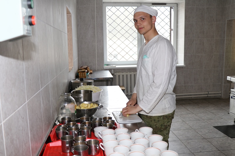 Питание в армии сбалансированное и полезное, богатое всеми необходимыми витаминами и микроэлементами. Меню для военнослужащих разработано специалистами, а в пищеблоке установлено качественное оборудование для его приготовления. В день нашего приезда на заставу, готовкой занимается профессиональный повар Елена Бальцевич. В тандеме с поваром на кухне ловко нарезает овощи и следит за порядком рядовой Владислав Грудин.