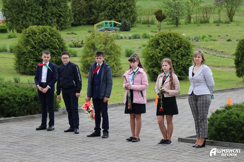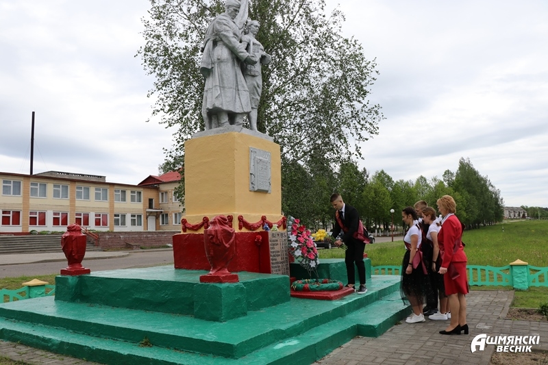 Па традыцыі, выходзячы са школьнага двара, выпускнікі адправіліся да помніка землякам, якія загінулі ў гады Вялікай Айчыннай вайны, — каб ускласці кветкі і сказаць “Дзякуй за мірнае неба!”