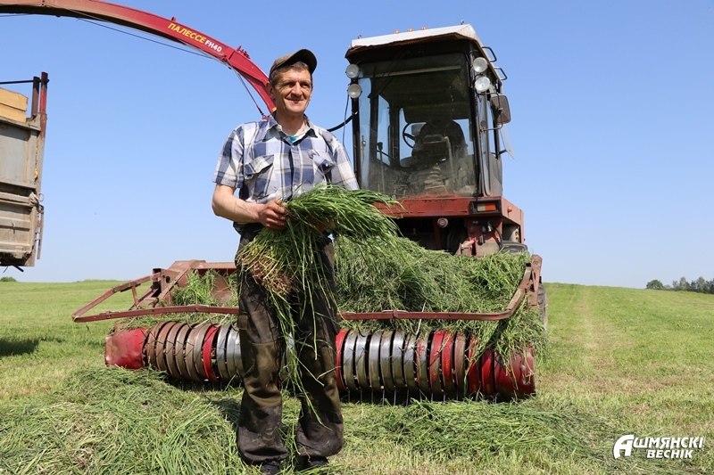 В экспериментальной базе «Боруны» с первого укоса предстоит убрать 1232 гектара многолетних трав и заложить 10050 тонн сенажа. Чисто злаковые культуры занимают примерно 40 процентов площадей, остальные – бобовые или бобово-злаковые смеси. Это означает, что корм будет высокопитательным из-за присутствия большого количества белкового компонента. Ежедневно в хозяйстве скашивают 50-60 гектаров трав. Этим заняты механизаторы Казимир Борисевич, Казимир Бражицкий, Виктор Свиридо и другие. На кормоуборочном комбайне работает Иван Капыш, Петр Якубель. Не бывает задержек с доставкой корма. Задействовано 7 единиц техники. На доставке работают механизаторы Эдуард Бернат, Александр Мингинович, Виктор Лукашевич, Иван Жабинский, Олег Пригодский. На обертывании зеленой массы в рулоны занят Николай Ольшук, а на ворошении провяленных трав механизаторы Виктор Гайдукевич, Виктор Щигло, Иван Пригодский. За световой день получается обернуть в стрейч-пленку 60-70 тонн корма. Если не помешает погода, при таких темпах с первым укосом трав можно справиться за 15-20 дней.