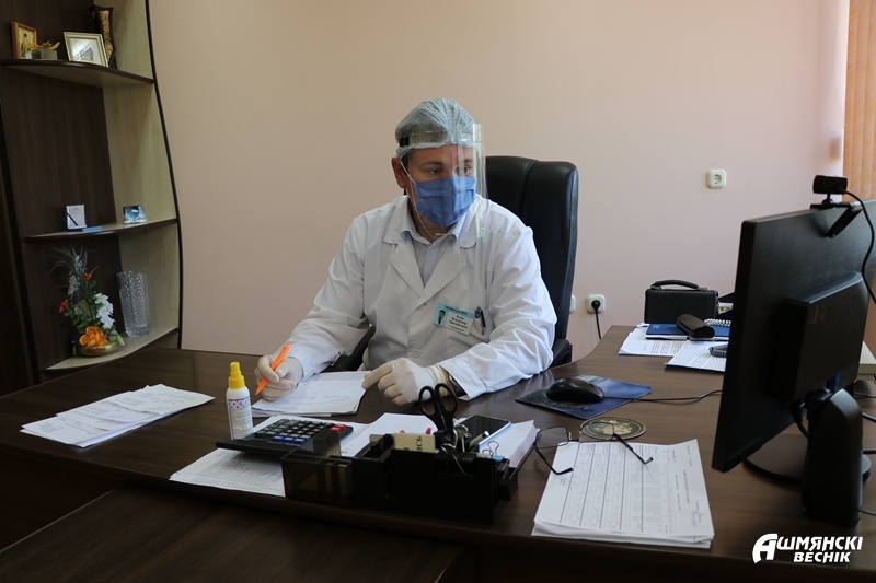 Первыми пациентами нашей больницы в марте стали контакты первого уровня, работники пункта пропуска «Каменный Лог», затем заболевшие из Сморгонского района. Первый заболевший житель Ошмянского района госпитализирован 26 апреля. К началу нарастания случаев заболеваемости COVID-19 в Ошмянском районе наша больница успела оснаститься средствами индивидуальной защиты. Благодаря поддержке райисполкома была произведена закупка всего необходимого: халатов, комбинезонов, бахил, респираторов. Целую партию средств индивидуальной защиты пошило УП «Ошмяны-быт».