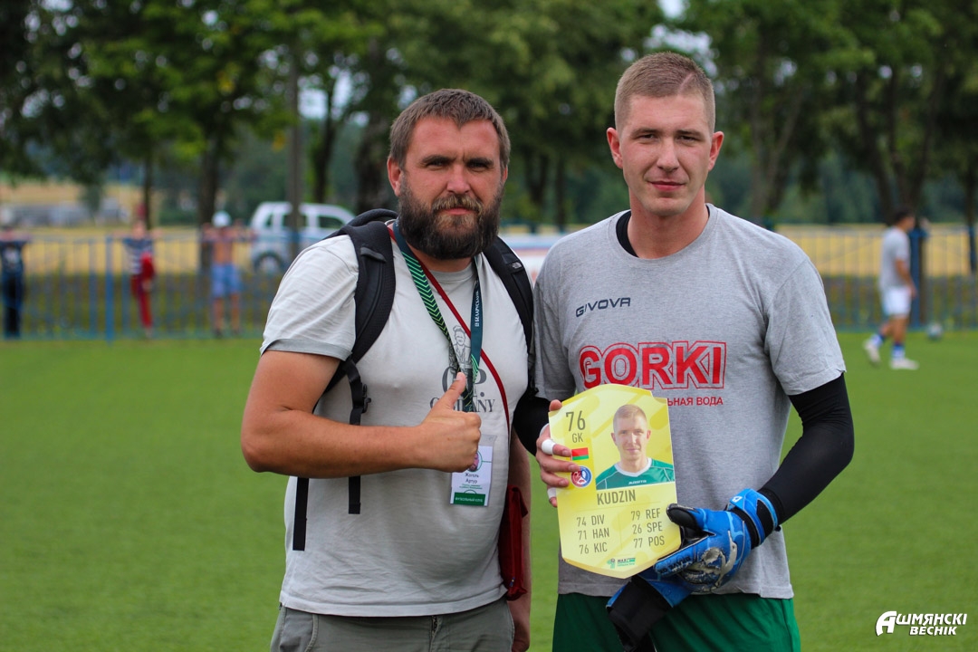 В перерыве матча прошел конкурс пенальтистов и Арсений Кудин получил приз, как лучший игрок мая по версии болельщиков «Ошмяны-БГУФК».