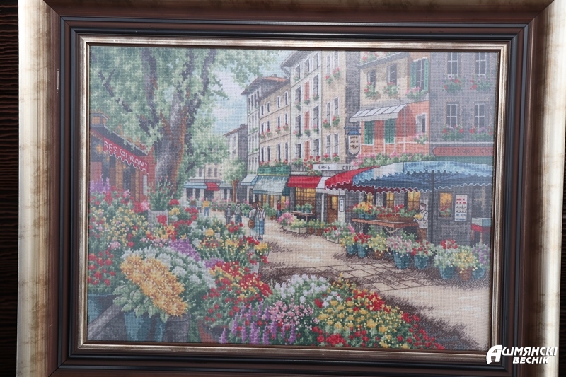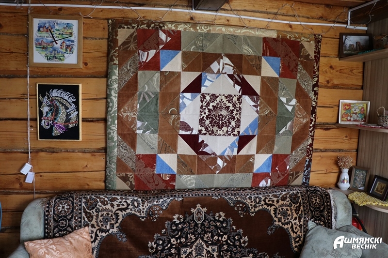 Вышивка – еще одно увлечение. Вышивала по ночам на протяжении полутора лет, по канве и по ткани. Добилась такого мастерства, что во время выставки в одной из минских галерей ее работ предлагали купить за две ее месячные зарплаты. Не согласилась! Вышивки, оформленные столичной фирмой в стильные рамы, украшают ее дом. В гостевом домике на стенах — коврики в стиле пэчворк, на кроватях такие же покрывала. Это тоже работы Ларисы. Для создания этих изделий в свое время были закуплены раскроечный мат, дисковый нож, линейка для пэчворка. Шторки, салфетки, прихватки, чехлы на чайники — не перечислить всего, что с филигранным мастерством вышито и украшено заботливыми руками хозяйки. Для того, чтобы освоить вышивку, была приобретена профессиональная вышивальная машина с программным управлением. Работы Ларисы украшают сегодня не только ее дом, но и Гольшанский детский сад, дома ее многочисленных друзей и знакомых. Сегодня она занимается алмазной вышивкой, пишет картины по номерам.