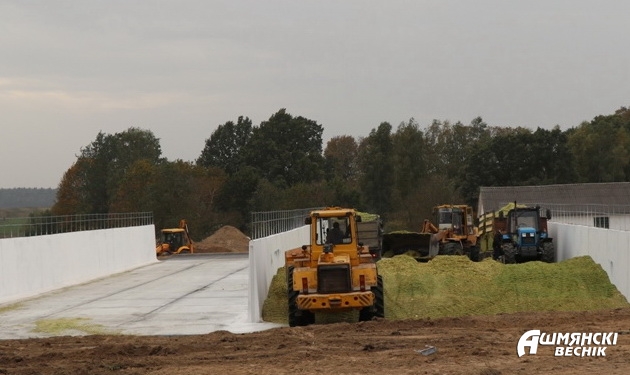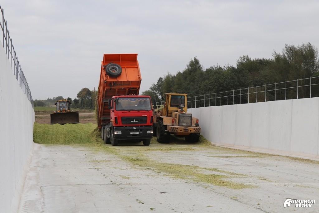 — При строительстве наземных траншей, объем каждой из которых составляет 2 тысячи тонн, были учтены все рельефные условия и технологические требования. Уникальность данного сооружения в том, что построено оно из Т-образных железобетонных блоков, образующих одну общую стену. Это, с одной стороны, удешевило строительство, а с другой — позволило возвести объект в сжатые сроки, — рассказывает директор ОАО «Ошмянский мясокомбинат» Иван Лупиш. — В связи с предстоящей реорганизацией КСУП «Ошмянская Ясная Поляна» путем присоединения части его к мясокомбинату наше предприятие решило заблаговременно позаботиться о предстоящем зимне-стойловом периоде. Наша основная задача — своевременная заготовка качественных кормов, которые являются залогом здорового и продуктивного стада.