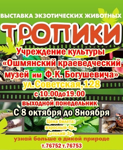 Ошмянский краеведческий музей имени Ф.К.Богушевича приглашает на выставку «Тропики», где вы сможете увидеть самых загадочных и необычных обитателей тропических лесов – змей, крокодилов и черепах.
