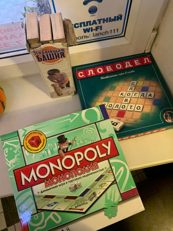 На подоконнике есть несколько популярных настольных игр, карандаши, фломастеры и бумага для маленьких гостей – что-то новенькое и не совсем привычное для кафе и баров нашего города. Это показывает о заинтересованности хозяев заведения не только накормить посетителей, но и организовать досуг клиентов.