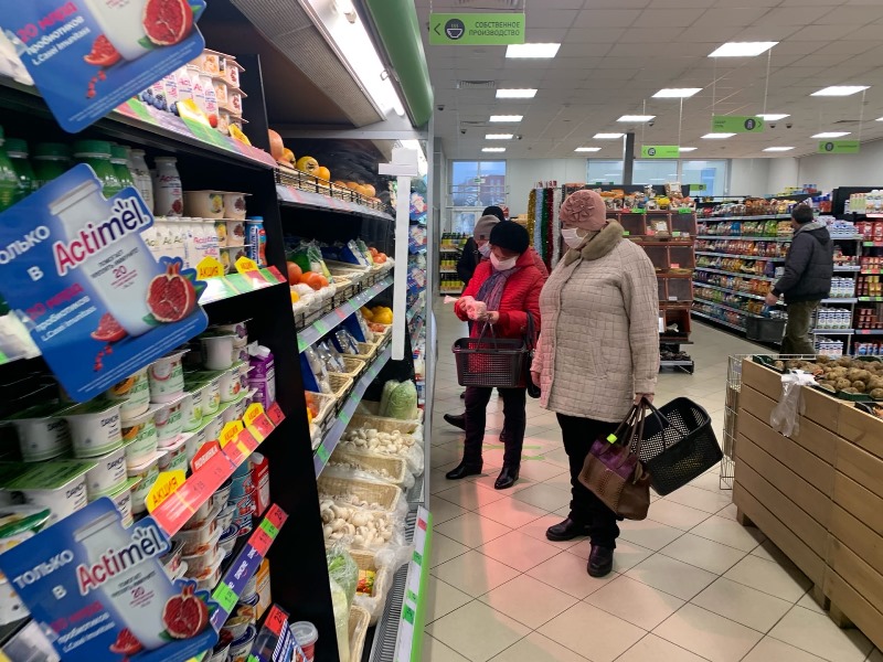 Такая же обстановка и в «Три цены». Кто-то рассматривает товар, спустив маску, а кто-то без СИЗ стоит у стеллажа вместе с толпой.