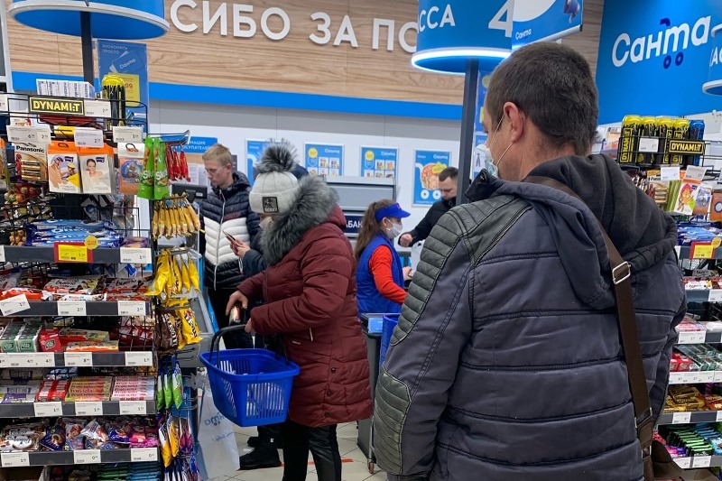 В магазине «Санта» покупателей также просят вывесками соблюдать масочный режим и социальную дистанцию. Безмасочники — просто на каждом шагу, но безопасное расстояние у кассы с большего соблюдается.