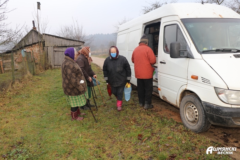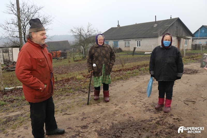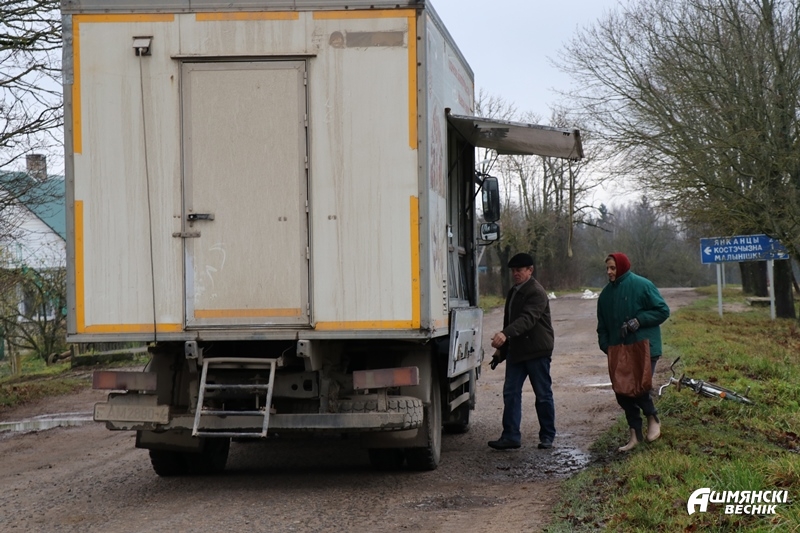 У стоянки магазин на колесах уже ждут местные жители, а остальные сельчане после продолжительного громкого сигнала выходят из своих домов. Из покупателей — всего четыре человека. По привычному списку покупает продукты Виктория Владимировна Чернявская; для отца, ветерана Великой Отечественной войны, Казимира Заблоцкого, делает покупки сын Иван, который гостит в деревне.