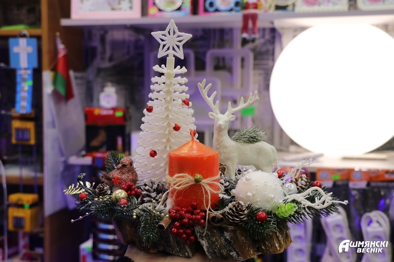 На изготовление композиции у хозяйки магазина уходит в среднем от трех до шести часов. Это при условии, если все составляющие имеются под рукой. Еловые и сосновые шишки, веточки, мох, кору, различные корешки Вера Владиславовна заготавливает сама. С изготовлением ящичков, корзинок, фонарей, рамок и оснований под композиции в виде спилов дерева помогает сын Вадим. Свечи, бусы, елочные шарики, фигурки зверей и птиц, различные краски и иную мелочь сейчас приходится заказывать в интернет-магазинах, а порой находить у своих коллег-предпринимателей в Ошмянах.
