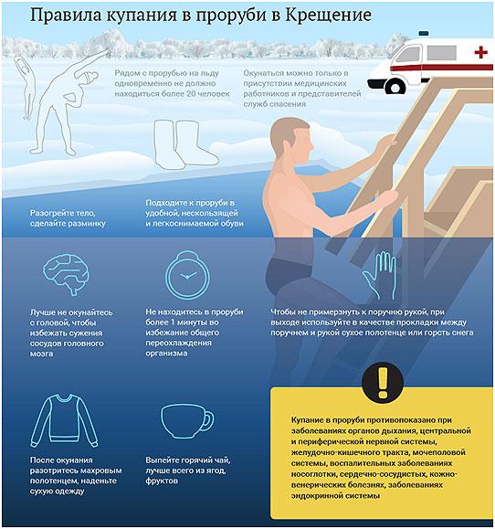 При входе в воду первый раз старайтесь быстро достигнуть нужной вам глубины, но не плавайте. Помните, что холодная вода может вызвать совершенно нормальное безопасное учащенное дыхание. Нельзя находиться в проруби более одной минуты во избежание общего переохлаждения организма. После купания разотрите себя махровым полотенцем и наденьте сухую одежду. Для укрепления иммунитета и во избежание переохлаждения необходимо выпить горячий чай.