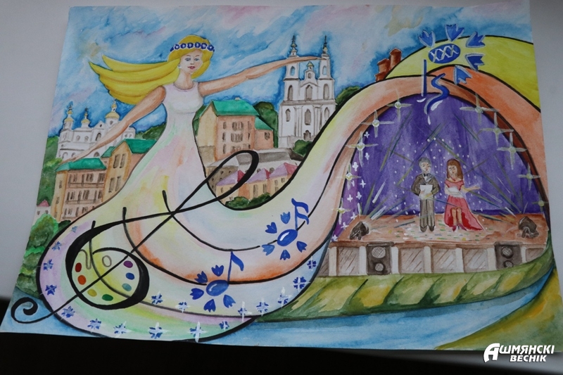 На полотне Дарьи изображена белоруска с венком из васильков на голове, а подол ее длинного белого платья, украшенного васильками и нотами, скрипичным ключом и палитрой – символами Славянского базара, укрывает сцену знаменитого амфитеатра. Глядя на эту картину действительно вдохновляешься и переносишься в фестивальный город Витебск, где над Двиной и Витьбой творили Марк Шагал и Юдель Пэн.