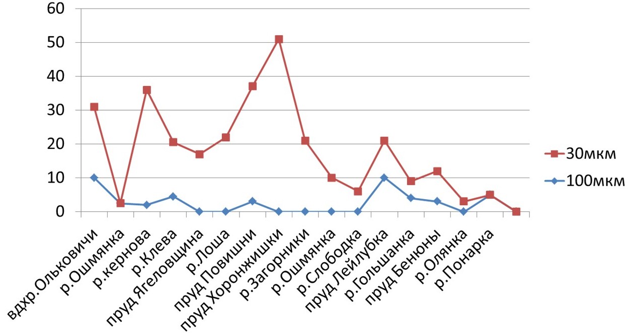 В пруду возле д. Повишни – 37. Река Кернова – 36. Ближайший населенный пункт к месту сбора проб – деревня Скилондишки. Проведение мелиоративных работ, близкое расположение железнодорожной станции также способствует загрязнению реки микропластиком. Водохранилище Ольковичи – 31. Река Лоша – 22. Река Загорники – 21.
