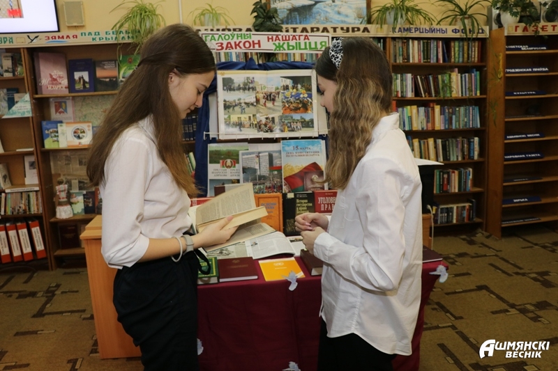 В городской библиотеке состоялся правовой урок «Конституционные права человека и гражданина», который провели сотрудники для учащихся гимназии. Приурочено мероприятие было значимому событию – Дню Конституции. К этому дню Людмила Аркадьевна Зарецкая и Ирина Анатольевна Полозок подготовили выставку литературы «Главный закон нашей жизни», на которой представлены книги по правовой тематике. На данную выставку уже обратили внимание посетители библиотеки и участники мероприятия. Учащиеся гимназии вместе со своим классным руководителем Еленой Владиславовной Буйвид с интересом прослушали выступление библиотекаря Ирины Анатольевны Полозок, в котором она рассказала про основной закон нашего государства. Особый акцент выступающая сделала на том, что Конституция Республики Беларусь воплотила в себе полный набор общепринятых прав и свобод человека, закрепленных в международных пактах. Помимо этого она подчеркнула, что в конституции предусмотрены и необходимые гарантии по их реализации. Именно Конституцией обеспечение прав и свобод граждан объявляется высшей целью государства. Права и свободы личности могут быть ограничены только в случаях, предусмотренных законом, в интересах национальной безопасности, общественного порядка, защиты морали, здоровья населения, прав и свобод других лиц. Основные права и свободы граждан не только признаются государством, но и защищаются им.