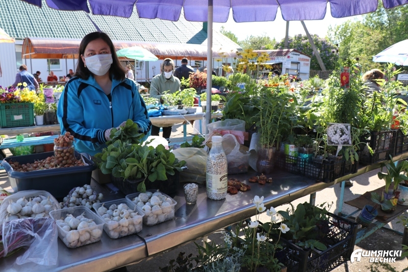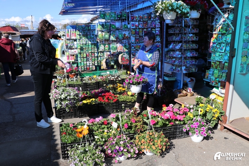 На самом входе на рынок расположилась со своим товаром жительница города Мария Францевна Мацкевич. Лет ей немало, уже идет восьмой десяток, но она по-прежнему выращивает на своем огороде и картофель, и лук, и фасоль. Торгует рассадой помидоров и цветочной. «Все, что выставлено на прилавке, растет возле дома по улице Дзержинского», — говорит женщина. И добавляет, что теперь на все нужны деньги: на лекарства, на поддержание в порядке дома, на строительство сарая, поэтому она нанимает машину, заправляет ее и выезжает на рынок. За ведро картофеля, надо сказать, отборного, она запрашивает восемь рублей, за рассаду помидоров просит тридцать пять копеек за штуку. Покупатели есть. Когда мы разговаривали с женщиной, интересовались рассадой цветов.