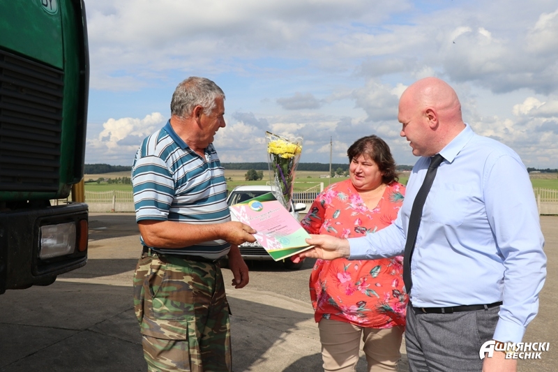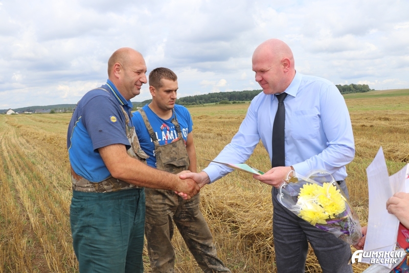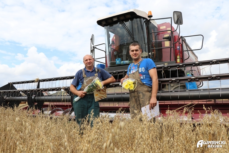 На Ошмянщине недавно чествовали комбайновый экипаж в составе Генриха Скаржинского и Андрея Давидовича из Гольшан с успешным преодолением знакового рубежа в тысячу тонн зерна.