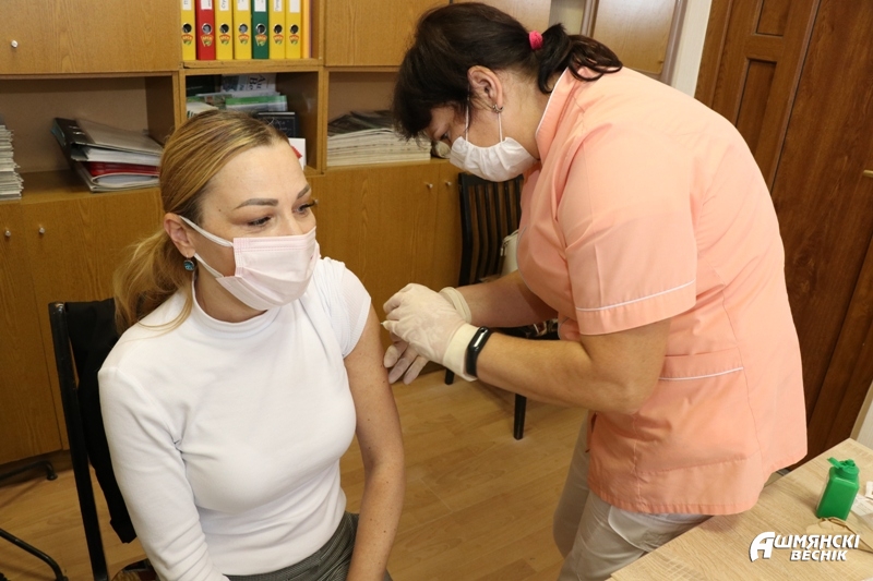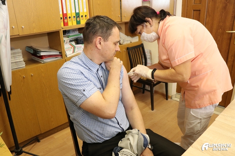 В Беларуси продолжается массовая вакцинация от COVID-19. В Ошмянах сделать прививку можно вакциной российского производства. На днях выездная мобильная бригада Ошмянской ЦРБ в очередной раз побывала в райисполкоме — на вакцинацию от коронавирусной инфекции здесь собралось около 30 человек. Все — работники различных отделов и служб.