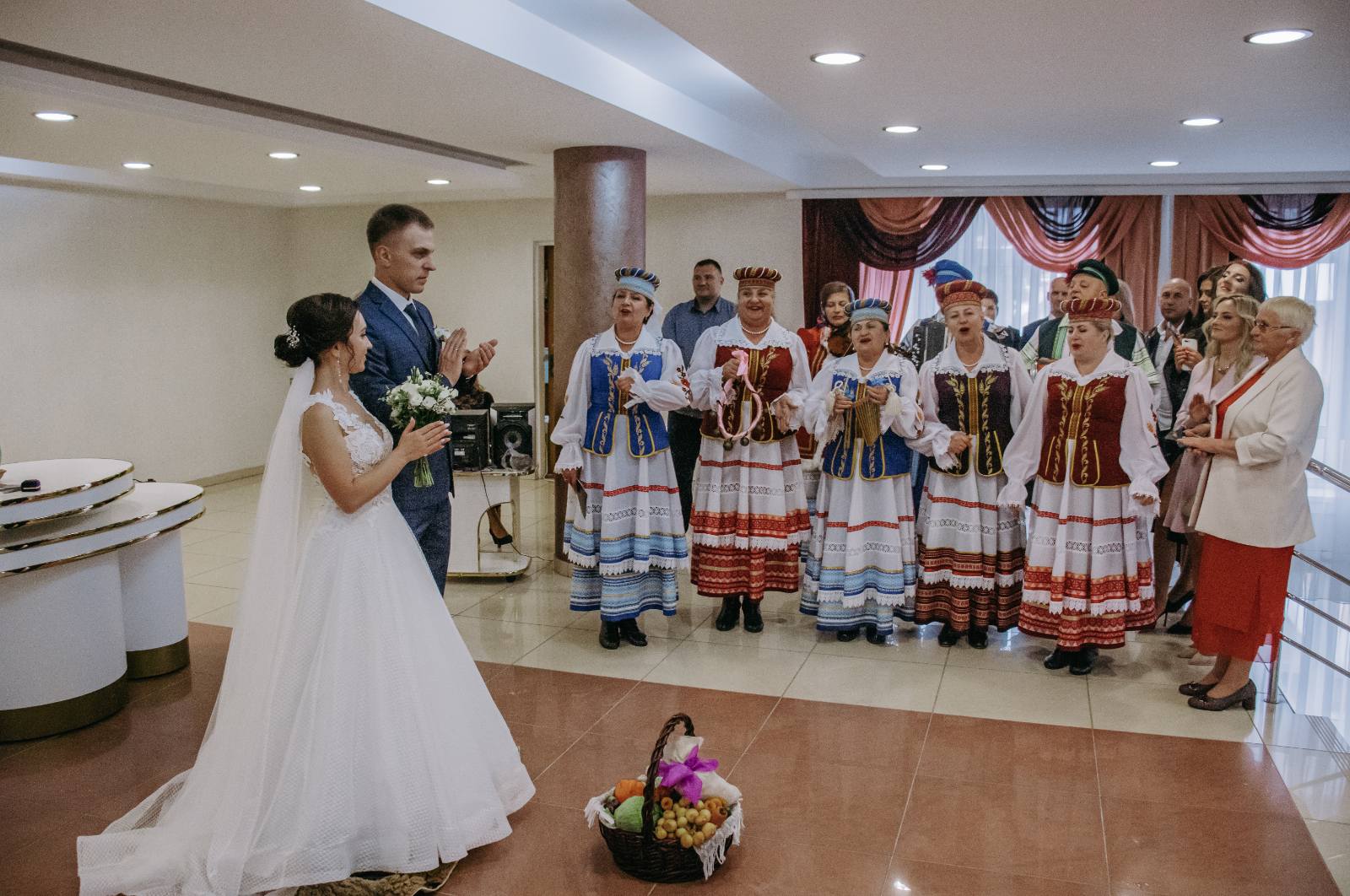 Первый подарок и цветы семейной паре были вручены от юбилейного города в музыкальном сопровождении народного ансамбля народной песни «Жытніца» Краковского отдела культуры и досуга.