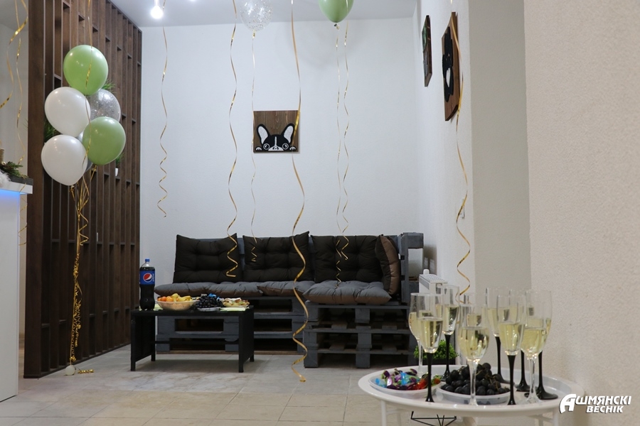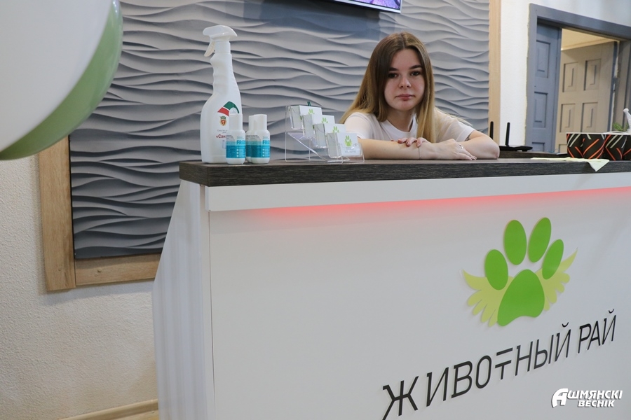 На входе в зоосалон гостей встречает администратор за стойкой ресепшн. Справа – зона ожидания, слева – магазин с товарами для питомцев. Отдельного внимания заслуживает стеллаж с курточками, костюмчиками и комбенизончиками для декоративных пород собак – до этого в Ошмянах купить эти товары было негде.