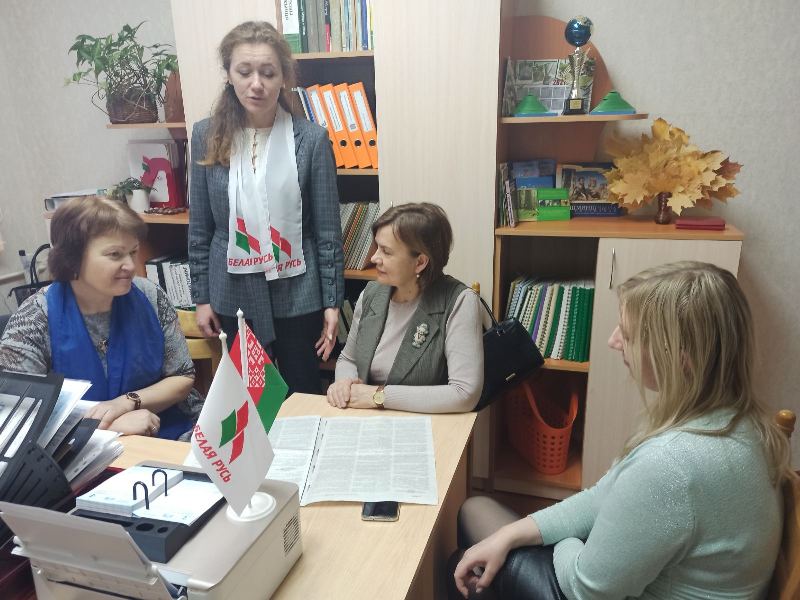 Активисты районных общественных организаций «Белая Русь» Светлана Барковская, «Беларусский союз женщин» Анна Ленковская, обьединения ветеранов Галина Яшина в диалоге с посетителями и по телефону давали пояснения по некоторым статьям проекта Основного Закона.