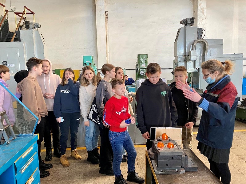 Ведущий специалист службы развития систем качества Ирина Литвинович рассказала школьникам о заводе, который начал отсчет своей истории с 1969 года. Школьники узнали о профессиях, востребованных на предприятии. Среди них — технолог, инженер-конструктор, оператор станков с программным управлением, литейщик пластмасс. Затем учащиеся посетили участок пластмасс, монтажный, инструментальный и механический цеха, где смогли увидеть, как изготавливаются как предметы быта — чесночницы, так и маяки проблесковые для тракторов, оснастки для литьевых машин. Старшеклассники понаблюдали за процессом сборки диффузоров и проверкой работоспособности проблесковых маяков на испытательном стенде.